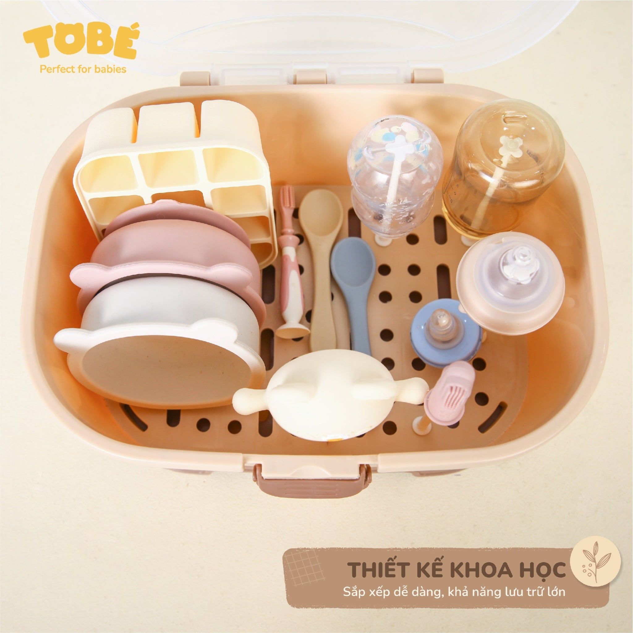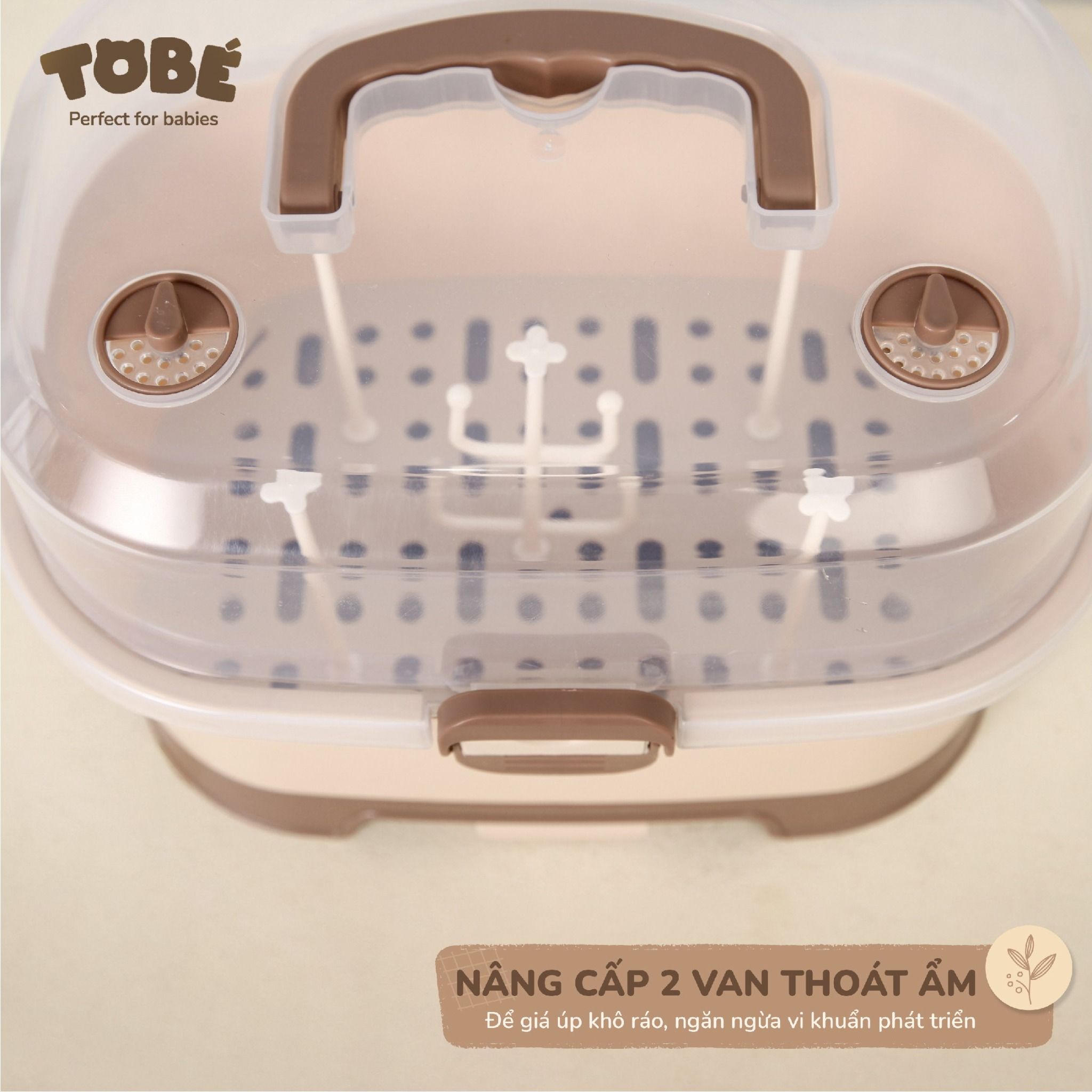 Nắp đậy chống bám bụi kèm theo quai xách dễ dàng mang theo trong các chuyến đi xa. Ngoài úp bình sữa, với khả năng lưu trữ lớn hơn, mẹ có thể đựng cốc thìa, hộp chia sữa, đồ ăn dặm của bé…