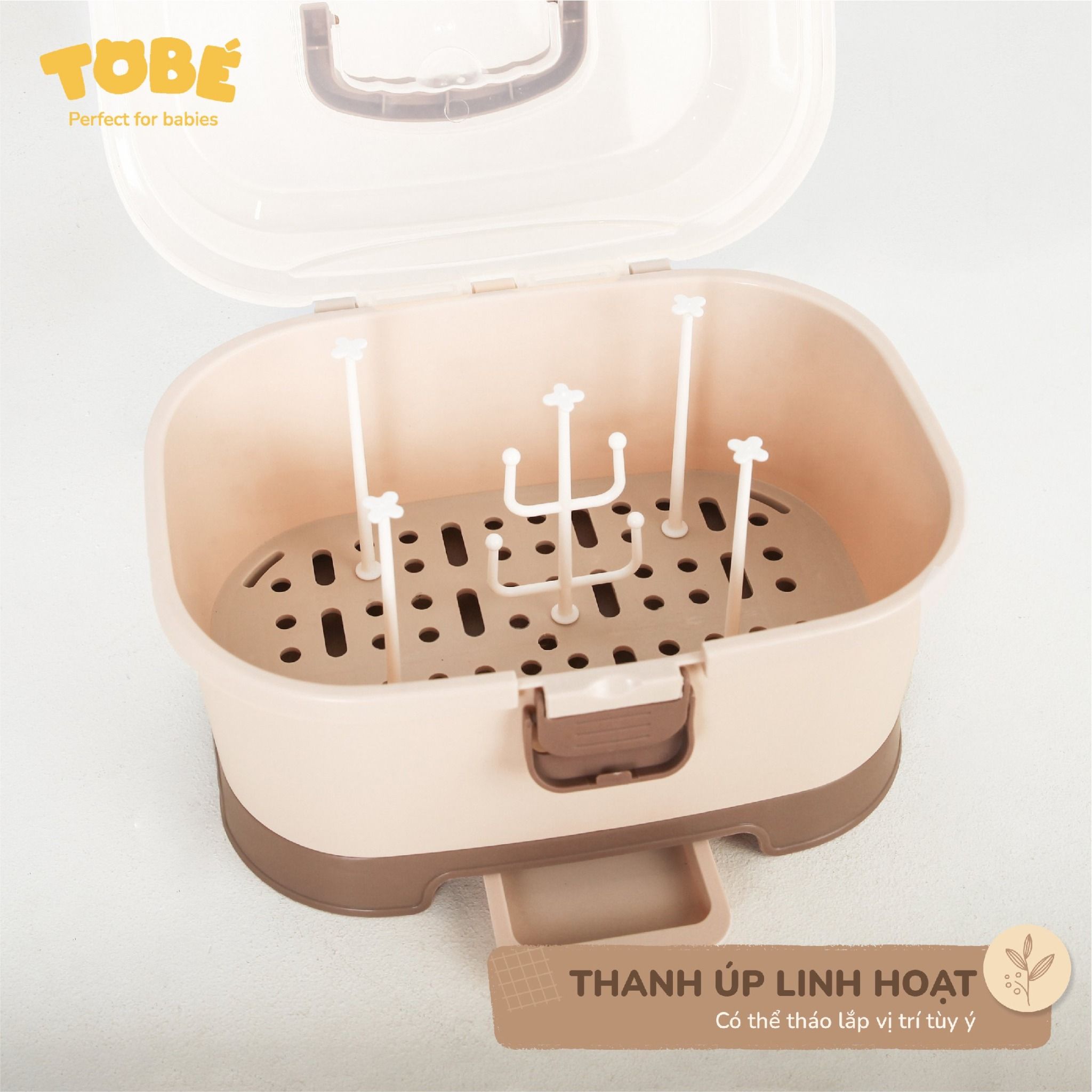 Thiết kế linh hoạt với các thanh đa năng có thể tháo lắp vị trí tùy ý dùng để úp bình và úp núm ti, ti giả… Lưới thoát nước được bố trí đều kết hợp với khay hứng nước bên dưới giúp môi trường bên trong luôn khô ráo, sạch sẽ